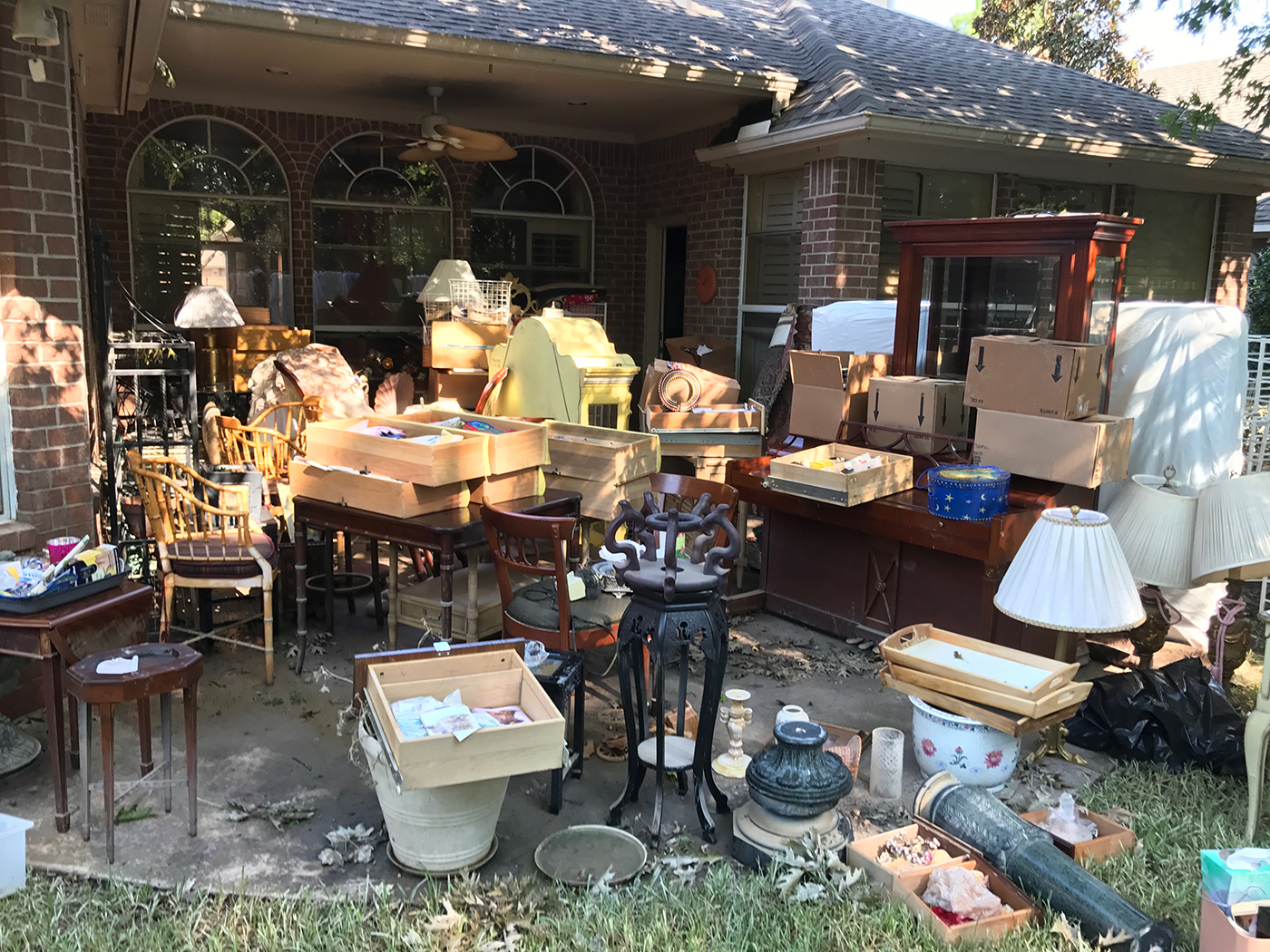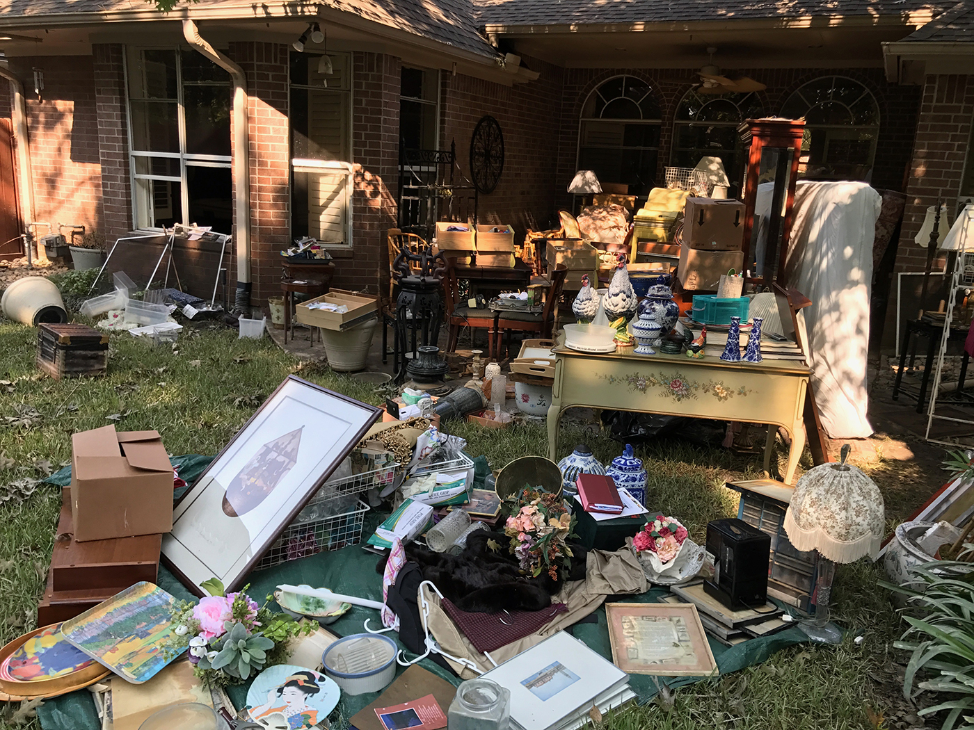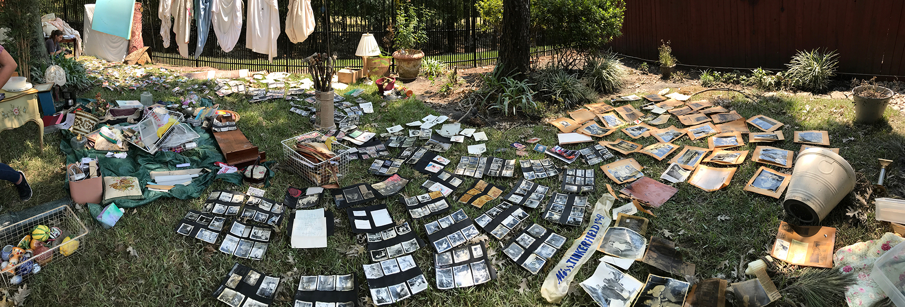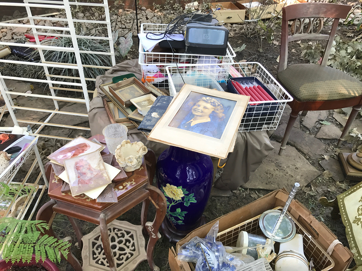 - Pile of pictures and possessions stacked in the backyard.