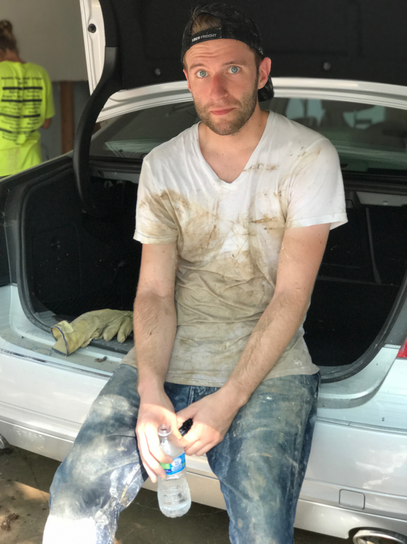- Mitch taking a much needed break after pulling wet sheetrock off the walls.